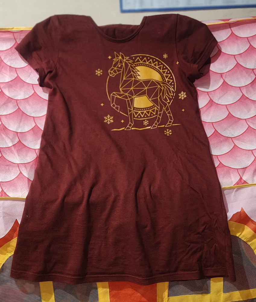 Новогодняя сорочка-туника для девочки с Лошадью — символом 2026 года — это сочетание уюта, мягкости и праздничного настроения. Модель создана специально для комфортного сна и домашнего отдыха, но при этом выглядит нарядно и современно. Такая сорочка станет любимой одеждой для ночного сна, утренних игр и уютных семейных вечеров. Изделие выполнено из трикотажного полотна из 100% хлопка плотностью 160 г/м². Натуральная ткань идеально подходит для детской кожи — она мягкая, дышащая, гипоаллергенная и приятная на ощупь. Хлопковый трикотаж не раздражает кожу, обеспечивает комфорт при любой температуре и сохраняет форму даже после многочисленных стирок. Главный декоративный акцент — яркий принт с Лошадью, выполненной в современном геометрическом стиле Low Poly. Такая графика выглядит празднично и стильно, но при этом остаётся лаконичной и уютной. Лошадь — символ Нового 2026 года, поэтому сорочка идеально подойдёт для зимнего сезона и подарков. Фасон модели продуман до мелочей: свободный, слегка расклёшенный силуэт не сковывает движений и обеспечивает полную свободу во время сна. Круглая горловина аккуратно обработана окантовкой, сохраняющей форму даже при частом использовании. Мягкие, эластичные швы не давят и не натирают кожу. Модель входит в семейную новогоднюю коллекцию Family Look, где представлены также мужские, женские и детские комплекты в едином стиле с Лошадью — символом 2026 года. Такая сорочка станет частью гармоничного семейного образа и подчеркнёт праздничную атмосферу.